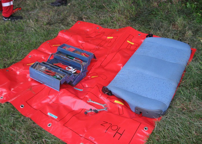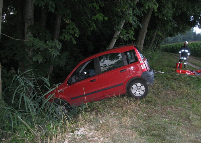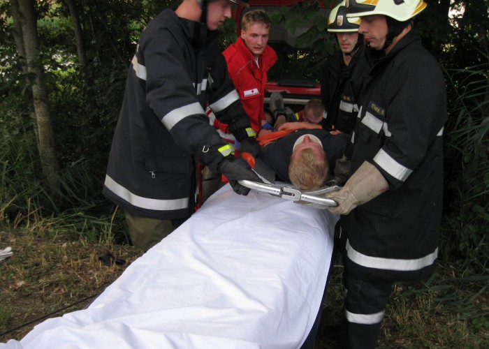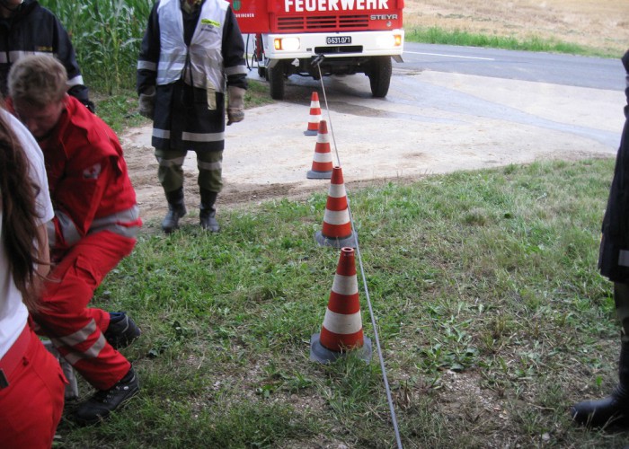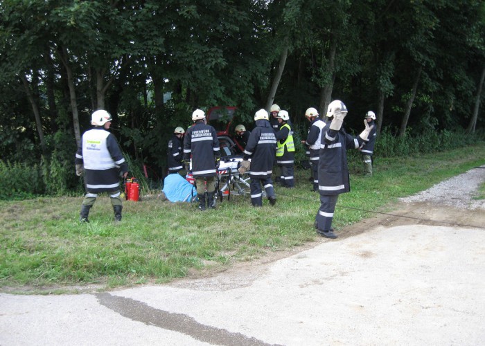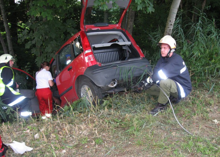 Nach einer kurzen Übungsbesprechung im Mannschaftsraum fuhren die drei Fahrzeuge zum Übungsort aus. Dort wurde sofort mit der Rettung der eingeklemmten Person im Auto begonnen. Diese konnte nach kurzer Zeit zur weiteren Versorgung dem Roten Kreuz übergeben werden, das mit einem Fahrzeug an der Übung teilnahm. Das verlassene Fahrrad, das sein verletzter Besitzer zurückgelassen hatte, wurde gleich danach gefunden und in der Folge eine Suchaktion eingeleitet. Anschließend konnte die Bergung des Fahrzeuges mittels der Seilwinde des Rüstlöschfahrzeugs begonnen werden. Nach der Fahrzeugbergung rückte die Besatzung wieder ins Feuerwehrhaus ein und erörterte in einer Schlussbesprechung, gemeinsam mit den Kollegen des Roten Kreuzes, gut und schlecht durchgeführte Arbeiten.