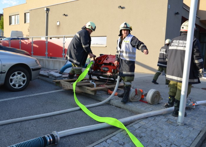 Übungsannahme war ein im Keller ausgebrochenes Feuer, das sich auf das Erdgeschoß ausbreitete. Hauptaugenmerk lag natürlich am Innenangriff mit schwerem Atemschutz mit Suche und Rettung zweier vermisster Personen. Auch außerhalb des Brandobjektes gab es einige Aufgaben zu bewältigen. Der Verkehr auf den angrenzenden Straßen musste geregelt und Löschwasser besorgt werden.