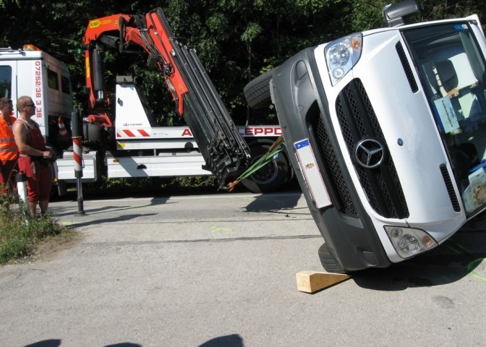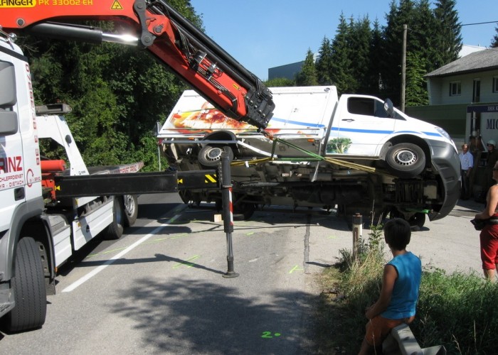Die Fahrer der beteiligten Fahrzeuge wurden glücklicherweise nicht verletzt. Die Fahrbahn musste gesperrt und der Verkehr wechselweise angehalten werden. Die Firma Prinz stellte den LKW wieder auf und sorgte für den Abtransport. Dankenswerterweise wurden uns aus dem gestürzten Kühlwagen zur Erfrischung ein paar Tüten Eis spendiert.