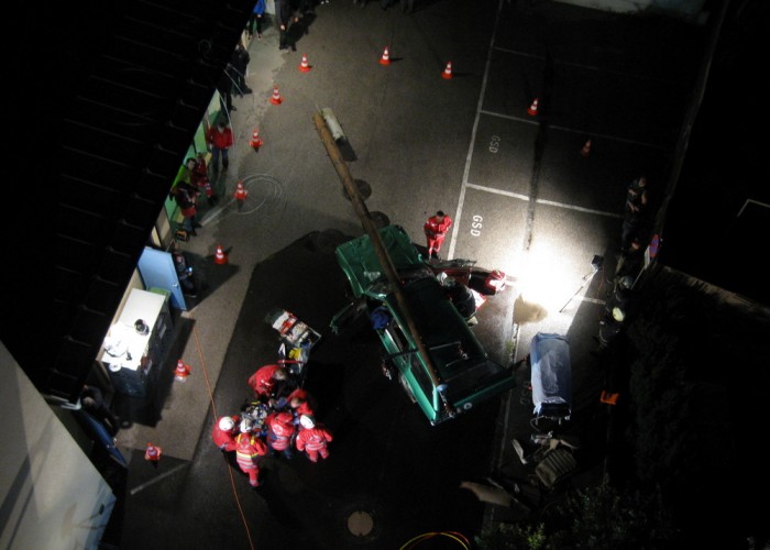 Beim Eintreffen an der Übungsstelle musste erst die Überlandleitung von der Energie AG Spannungsfrei gemacht werden, bevor die Einsatzkräfte den Gefahrenbereich betreten durften. Mit dem Spreizer wurde sofort die Befreiung der nicht ansprechbaren Fahrerin begonnen. So schnell die Lenkerin befreit war, umso länger gestaltete sich die Rettung des Beifahrers, der zwar ansprechbar war, aber seine Beine nicht mehr spürte. Mit größter Vorsicht wurde er dann über die Heckklappe des relativ geräumigen Kombi-PKWs ins Freie gebracht.