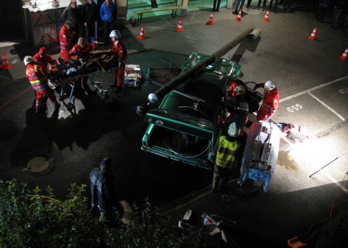 Im Rahmen ihres Bereitschaftsabends luden uns die Kollegen von der Dienststelle des Roten Kreuzes Bad Hall zu einer Übung ein. Das Übungsszenario war ein PKW mit zwei verletzten Personen, auf den ein Strommast gefallen war.