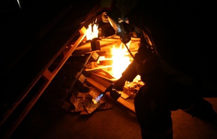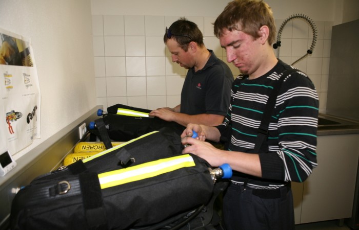 Diesmal gab es zusätzlich zur eigentlichen Aufgabe der Personenrettung und Brandbekämpfung ein umfangreiches Rahmenprogramm. Die Gruppen wurden erst in einem Briefing mit dem Übungsablauf vertraut gemacht und mit einer kurzen Präsentation auf Einsatztechniken hingewiesen. Für ein möglich realistisches Übungsszenario mussten die Trupps in der Umkleide auf ein Sirenensignal warten. Danach wurde im Fahrzeug auf einem simulierten Einsatzweg der schwere Atemschutz angelegt. Beim Eintreffen am Übungsobjekt bekam der Trupp den Einsatzauftrag für die Personensuche und die Brandbekämpfung.