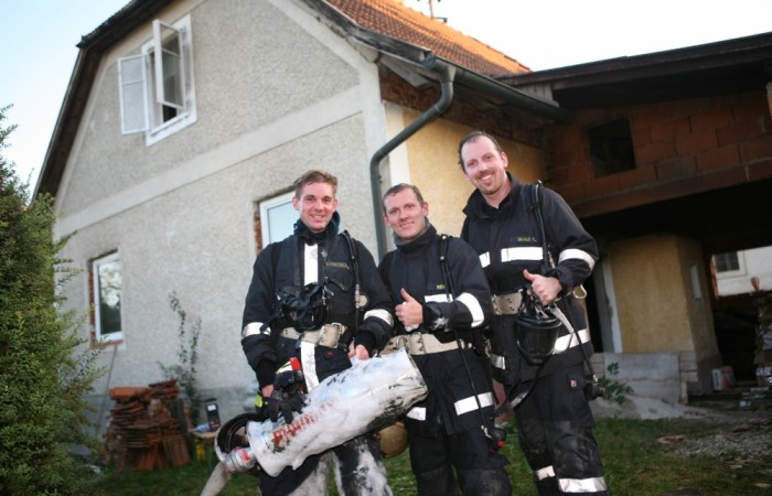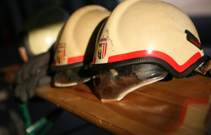 Im Haus erwartete die Trupps ein 80-Kilo-Dummy, der bei drückender Hitze vom ersten Stockwerk durch das enge Treppenhaus nach draußen getragen werden wollte. Nach erfolgter Personenrettung durften die Atemschutzträger eine Weile durchschnaufen, bevor es der Hitze entgegen in den Keller zum Löschen des Brandherdes ging. Davon, dass spätestens dort die Teilnehmer an ihre körperlichen Grenzen stießen, zeugen einige ältere Helme, die nach der Übung schon etwas mitgenommen aussahen. (Foto unten)