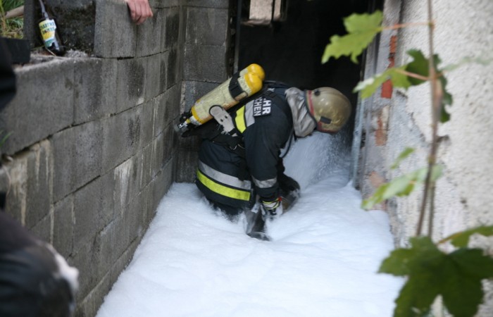 Am Ende der Übung flutete ein letzter Trupp den Keller mit Schaum, um dem Feuer endgültig den Garaus zu machen.
