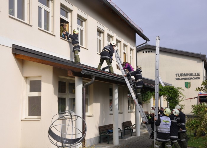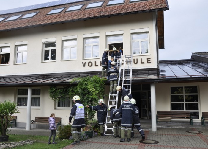 Regelmäßig wird mit den Kindern und dem Personal der Volksschule der Ernstfall erprobt. Hauptaugenmerk liegt darauf, die Kinder alle schonend zu evakuieren und ihnen die Angst vor Atemschutzträgern und der Rettung über eine Leiter zu nehmen. Unterstützt wurden wir dabei von den Kameraden der Feuerwehr Bad Hall, die mit der Drehleiter an der Übung teilnahmen.