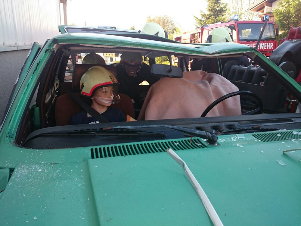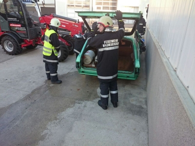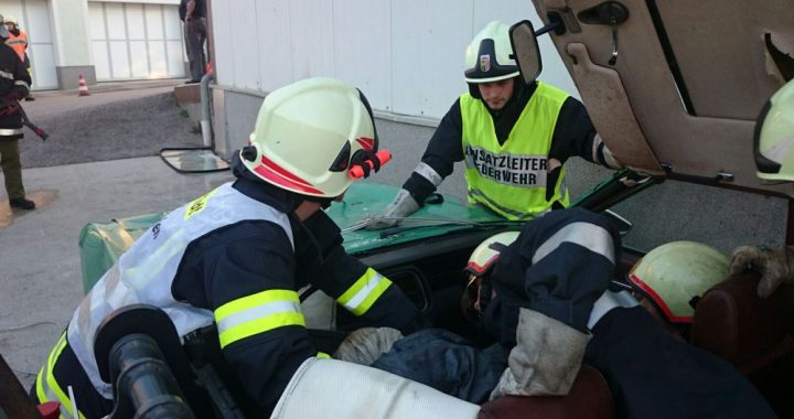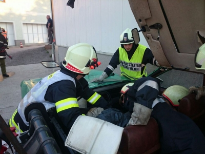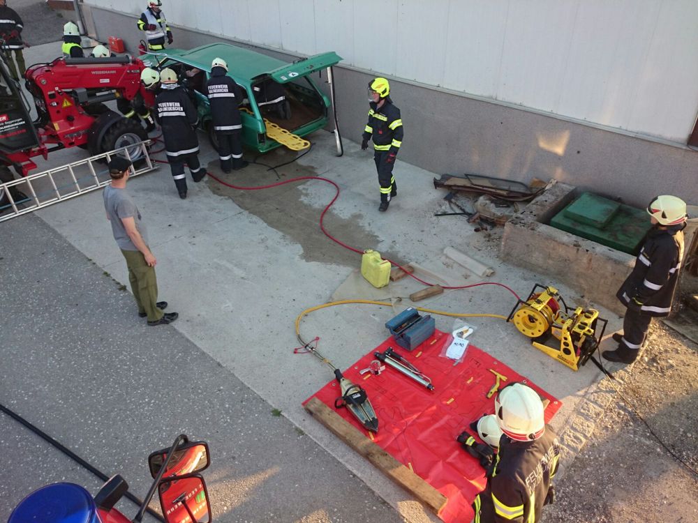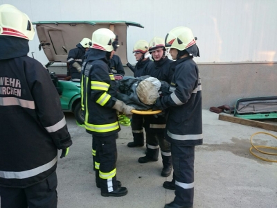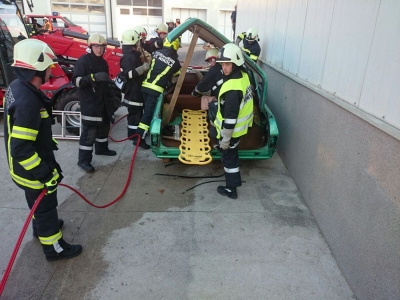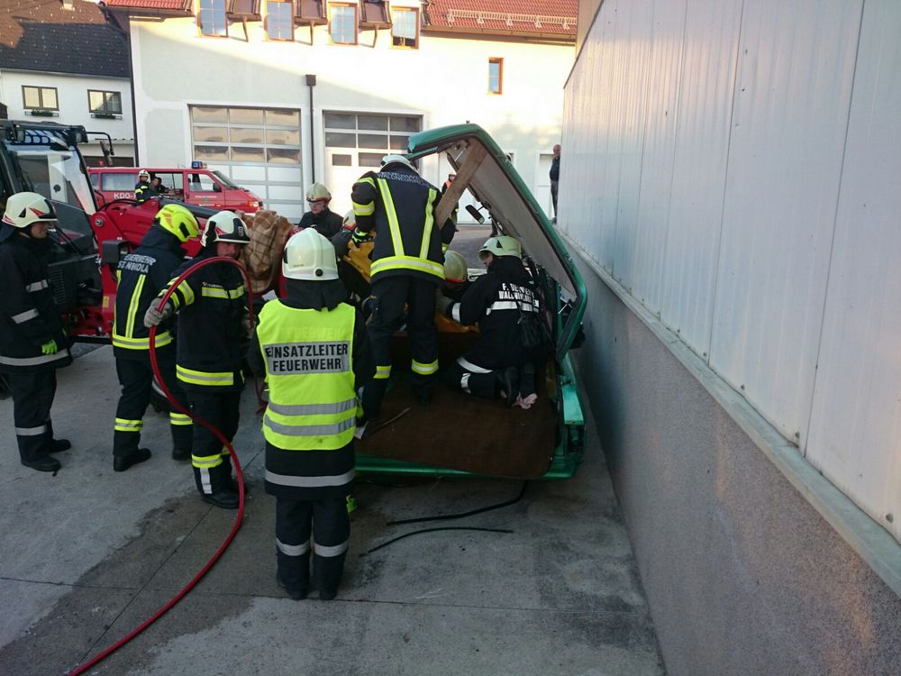 Mittelpunkt des Szenarios war ein geparkter PKW mit drei Insassen. Ein ins Rollen gekommener Hoflader spießte diesen regelrecht mit den Gabelzinken auf und verletzte den Fahrer tödlich. Es galt, die beiden auf der Beifahrerseite sitzenden Fahrgäste aus dem Fahrzeug zu retten. Erschwerend kam hinzu, dass der PKW vom Hoflader an eine Wand gedrückt wurde, und der Zugang von der Beifahrerseite nur schwer möglich war. Selbstverständlich dürfen in solchen Situationen die brennbaren Gasflaschen im Kofferraum nicht fehlen.