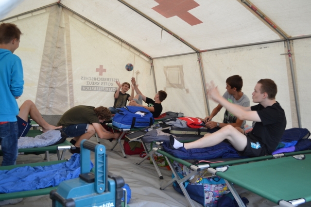 Nachdem das Zeltdorf aufgebaut war und alle ihre Feldbetten bezogen hatten, ging es mit dem Orientierungsmarsch los. Am Weg mussten die Kinder auf zwei Stationen ihr Können im Bogenschießen und Kegeln beweisen und durften auf einer Station sogar selbst ihr erstes Feuer mit dem Feuerlöscher löschen.