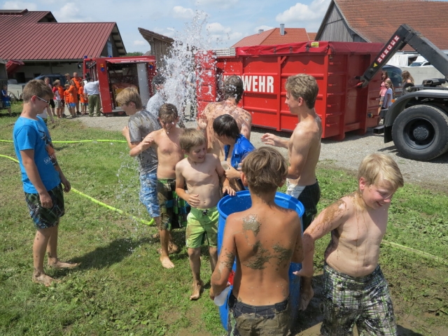 Eine Intensivwäsche am Strahlrohr später waren die Jungs bereit für die Fahrzeugdemonstration der verschiedenen Stützpunktfahrzeuge des Bezirks. Vor allem der Hubsteiger und das Kranfahrzeug wurden mit regem Interesse besucht, aber auch das SRF und das Atemschutzfahrzeug hielten einige interessante Details bereit.