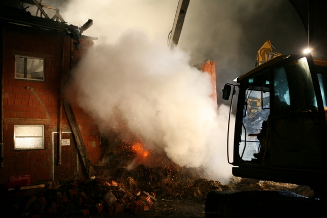 Als der Brand unter Kontrolle war, wurden zwei Bagger organisiert, mit denen das Stroh vom Dachboden abgeräumt wurde. Am Boden konnte es ausgebreitet und abgelöscht werden. Während den Räumungsarbeiten stützten die Einsatzkräfte die Decke über dem Kuhstall, um ein Einstürzen unter dem schwerer gewordenen nassen Stroh zu verhindern.