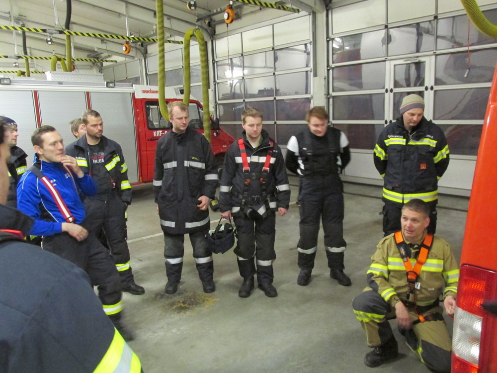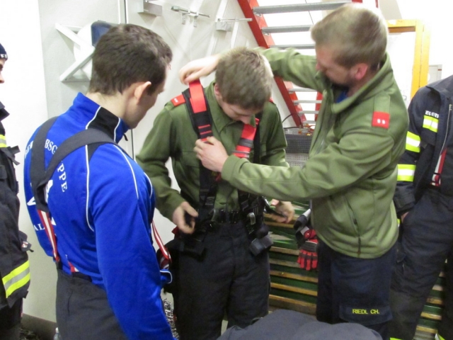 Nach einem theoretischen Teil, in dem verschiedene Aspekte wie Sicherheitsvorkehrungen oder Gefahrenpotentiale behandelt wurden, übten sich die Kameraden in der Praxis. Zuerst wurden die bei einem Sturz auftretenden Kräfte sehr anschaulich demonstriert, indem die Teilnehmer eine Rampe hinunterrutschten und am Ende durch ein am Sicherungsgurt befestigtes Seil aufgefangen wurden.