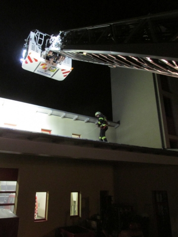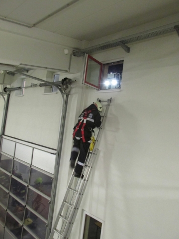 Danach mussten die Gruppen in einem Übungsszenario einen Kameraden sichern, der am Vordach der Fahrzeughalle Arbeiten durchführen sollte. Dabei wurden verschiedene Arten der Seilführung demonstriert und deren Vor- und Nachteile besprochen.