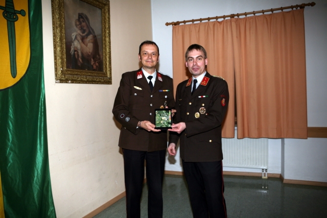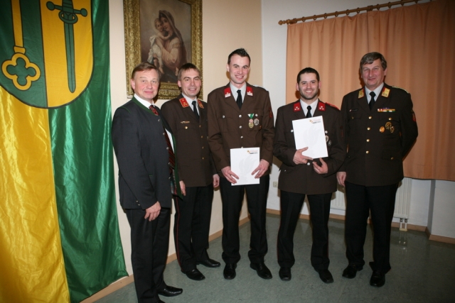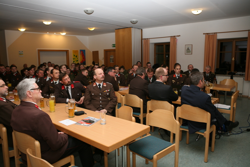 Insgesamt nahmen 82 Mitglieder und 6 Ehrengäste an der Veranstaltung teil und nutzten das Platzangebot des Pfarrsaales bis zum letzten Platz aus. In den Berichten der Kommandomitglieder schlugen sich neben zahlreichen Übungen und Schulungen am stärksten der Großbrand in Steinersdorf, das Spitzenergebnis der Jugendgruppe am Landesbewerb und das neu angekaufte KLFA-L nieder. Bei dessen Anschaffung konnte sich die Wehr neben der finanziellen Leistung auch mit dem Bau der Beladungscontainer in Eigenregie einbringen. Die beiden Kameraden, die für den Bau der Container für das neue Fahrzeug hauptsächlich verantwortlich waren, Lukas Mayer und Peter Ziebermayr, wurden dafür mit der bronzenen Verdienstmedaille des Bezirks geehrt.