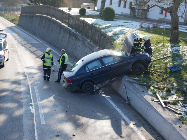Der Wagen kam zur Hälfte auf einer Mauer zum Stehen. Beim Eintreffen der Feuerwehr war der Fahrer bereits befreit. Er kam mit leichten Verletzungen davon und wurde vom Roten Kreuz ins Krankenhaus Steyr gebracht.