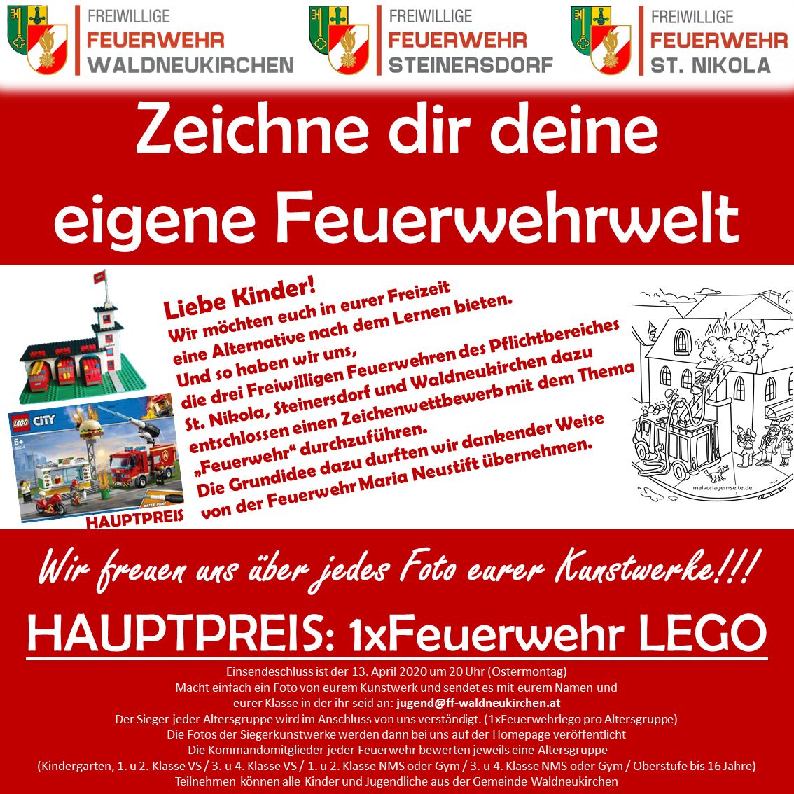 Da ihr ja derzeit nicht in die Schule gehen könnt und deswegen leider zu Hause bleiben müsst, haben wir uns die drei Feuerwehren des Pflichtbereiches Waldneukirchen dazu entschlossen einen Zeichenwettbewerb zu veranstalten. Dankenswerter Weise durften wir die coole Idee von der Freiwilligen Feuerwehr Maria Neustift und deren Jugendbetreuer Alexander Kopf übernehmen.