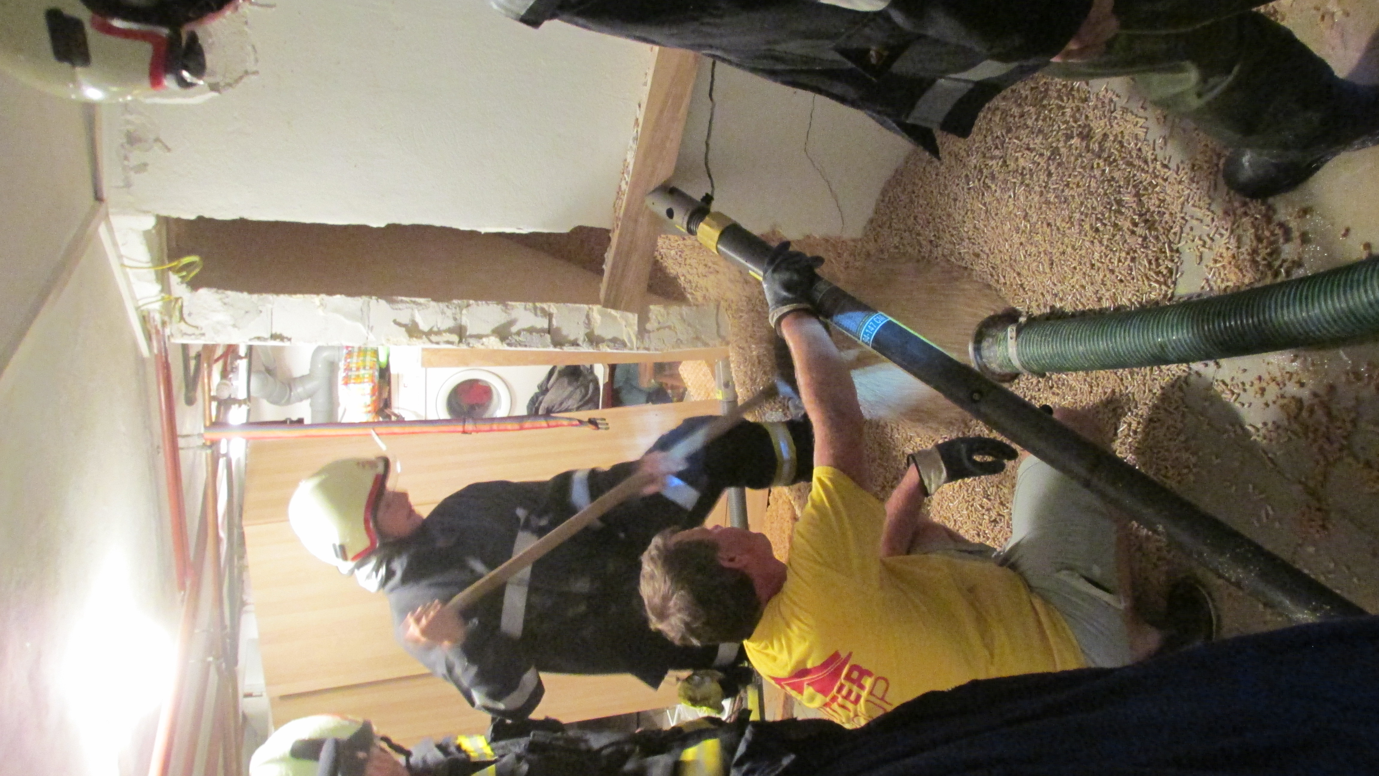 Bei unserer Einsatzadresse quillten Pellets auf Grund eines Wassereintritts auf und drückten die Mauern des Lagerraumes auseinander. So weit möglich wurden die Mauern gestützt und der Pelletsbunker mit einem Saugwaagen entleert und der Wasserschaden beseitigt.