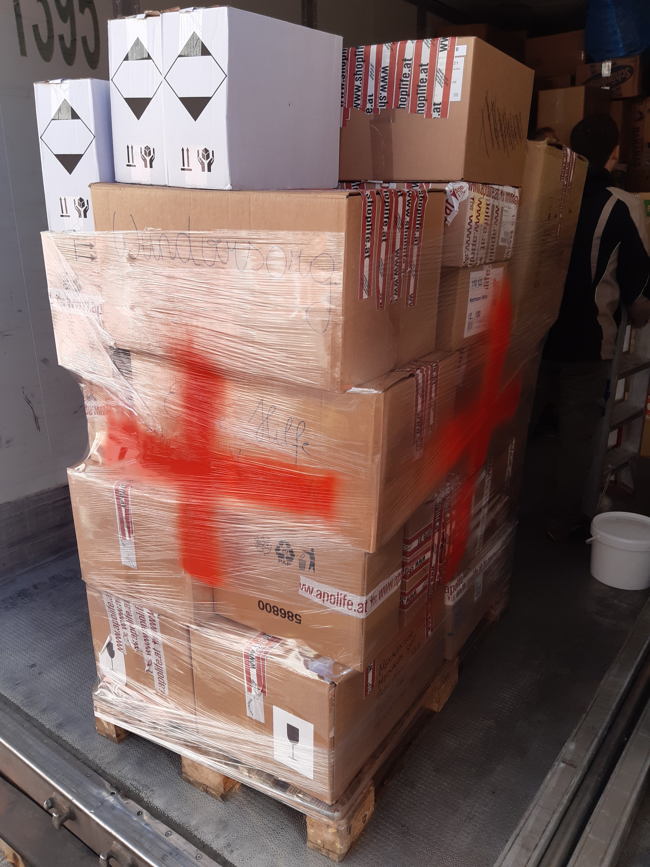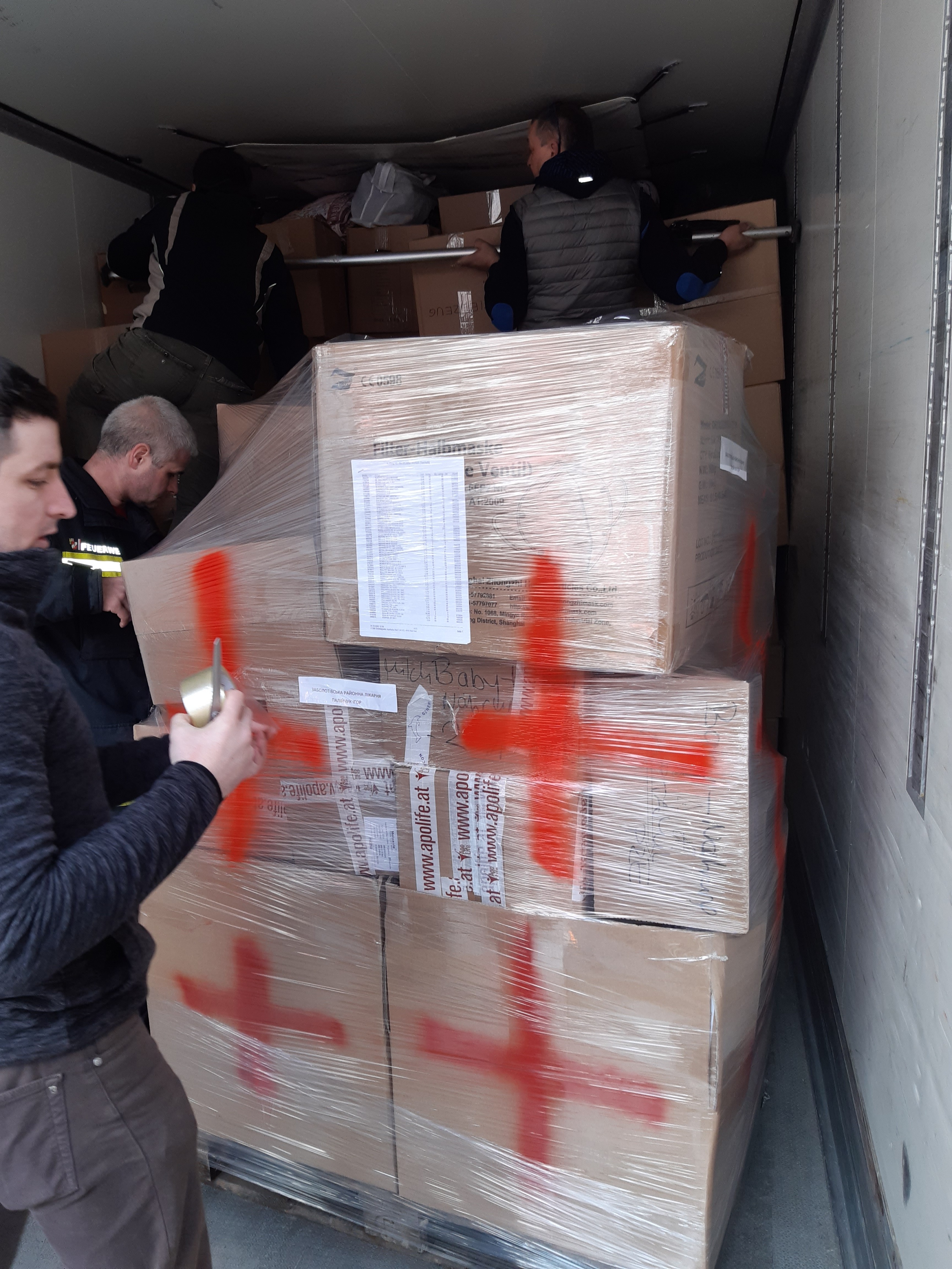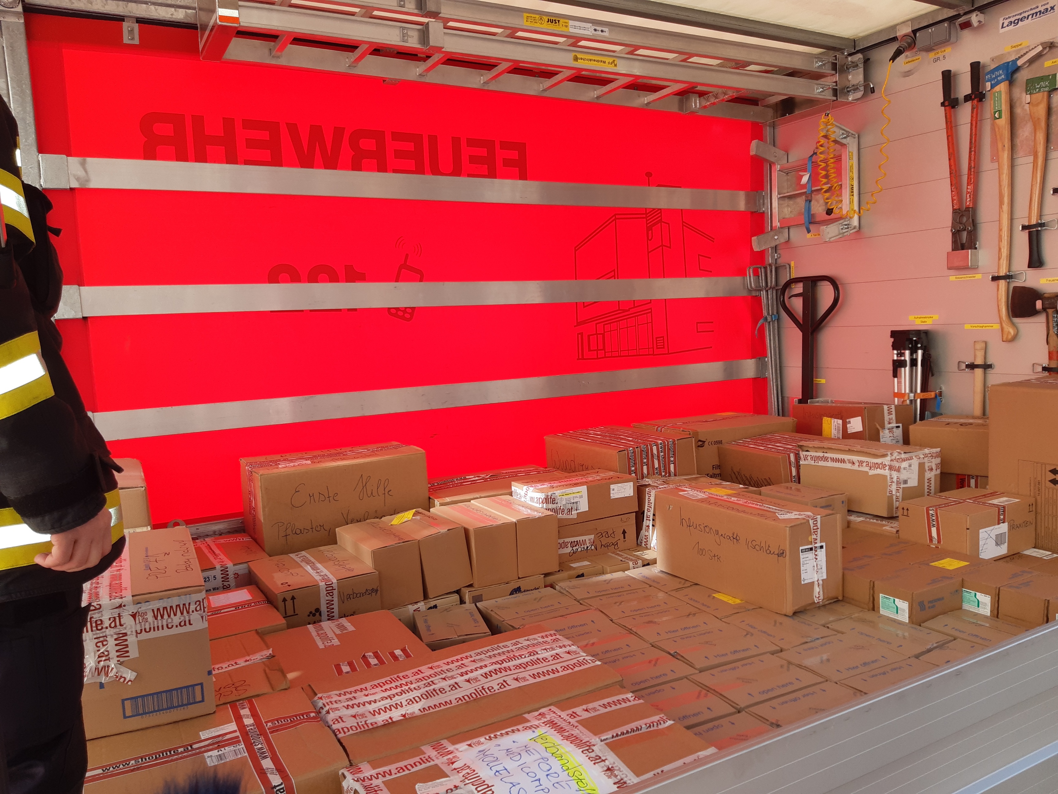 Mit unserem KLFA-Logistik transportierten wir Medizinische Unterstützung von der Dreifaltigkeit-Apotheke Bad Hall nach Grünburg, wo diese auf einen Hilfs-LKW verladen wurde.